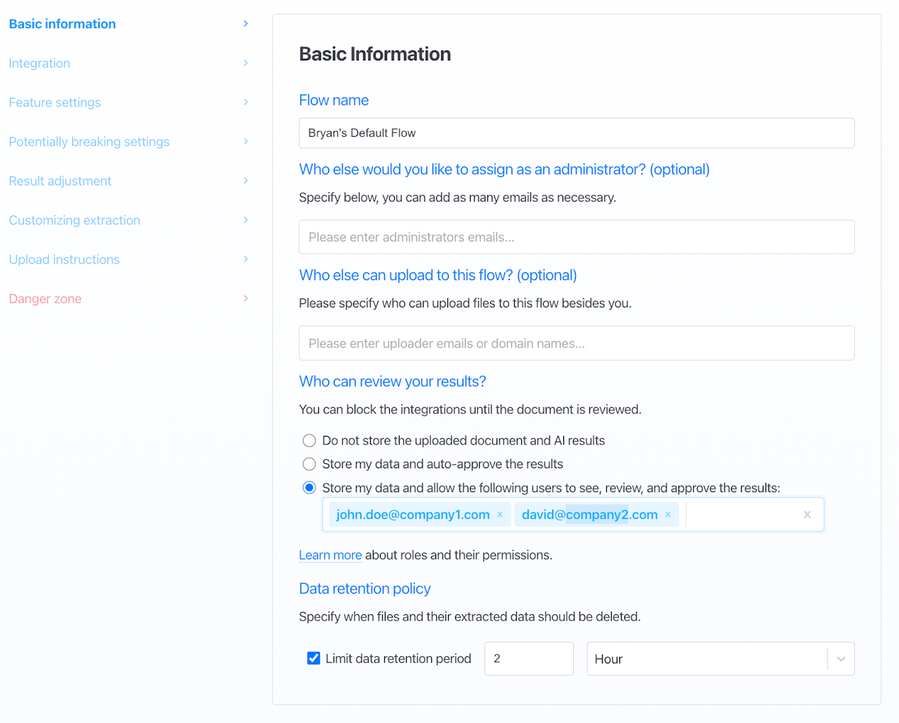 Our customers can utilize their in-house reviewers by adding them to our HITL workflow integration known as Flows. Review teams can easily be built by simply adding their email addresses and domain names through settings. To include your reviewers, follow these steps: 1) Go to your Flow integration settings. 2) Navigate to "Basic Information." 3) Scroll down to "Who can review your results?" 4) Select "Store my data and allow the following users to see, review, and approve the results:'' and add your email below. 5) Optionally, set the data retention period.