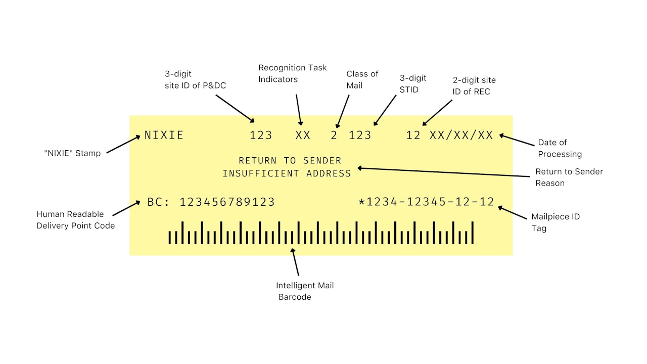 Our AI can read Nixie labels used by the United States Postal Service to a piece of mail that is undeliverable as addressed. Nixie labels are a valuable tool to keep databases up-to-date and ensure money is not spent on mail that will never reach the intended recipient.