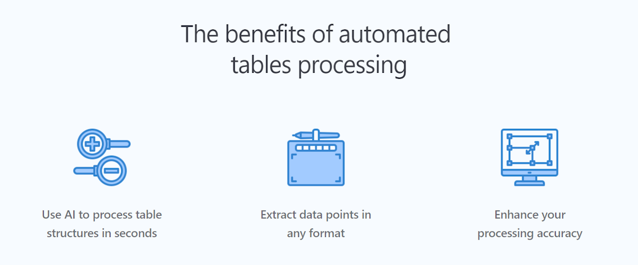 Process your document tables without the need to create expensive models. Try it now, upload any form and Base64.ai will detect all tables on your document.