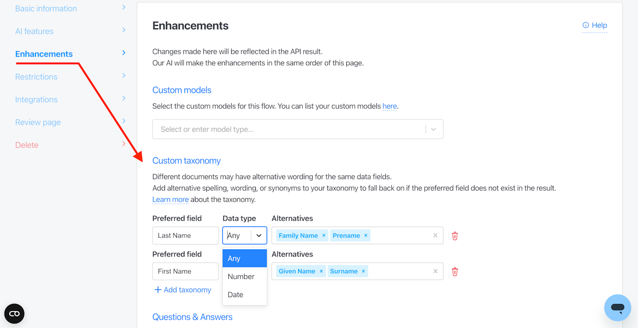 With this feature, you can specify the desired wording for a field and list all possible alternatives that may appear in the document data. By including alternate spellings, synonyms, or variations of data field names, users can ensure accurate data extraction, even when dealing with inconsistent naming conventions.